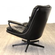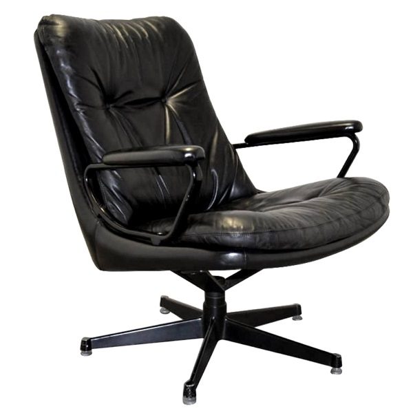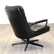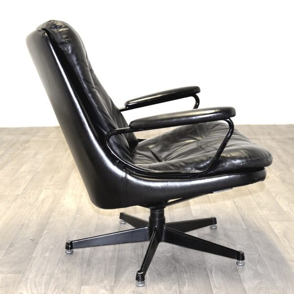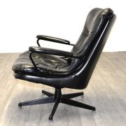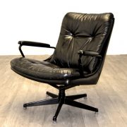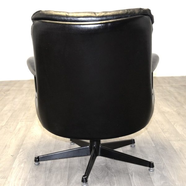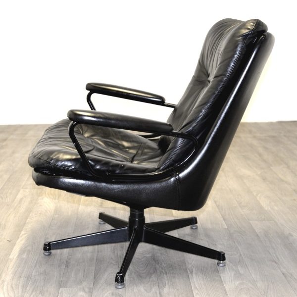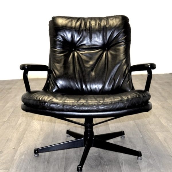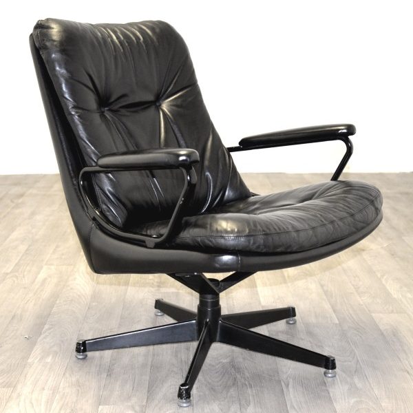 Original vintage Gentilina sswivel armchair by Strässle of Switzerland. The sister chair to the King Chair by Strässle and designed by Andre Vandenbeuck of Belgium. This swivel lounge armchair is upholstered in stunning soft black leather. Built in Switzerland to incredibly high standards, the armchair stands on a brushed metal swivel base. This piece is brought to you in excellent vintage condition, wear appropriate for age and use.