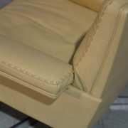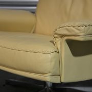 Highly desirable and rarely available matching pair of original De Sede DS 35 swivel armchairs with ottomans. Built in the 1970`s by De Sede craftsman from Switzerland, these matching swivel lounge armchairs are brought to you in excellent vintage condition. Upholstered in beautiful soft cream aniline leather with superb whipstitch edge detail, these armchairs are a rare find and had very little use. We also have a 2 seater sofa/loveseat from the same suite.